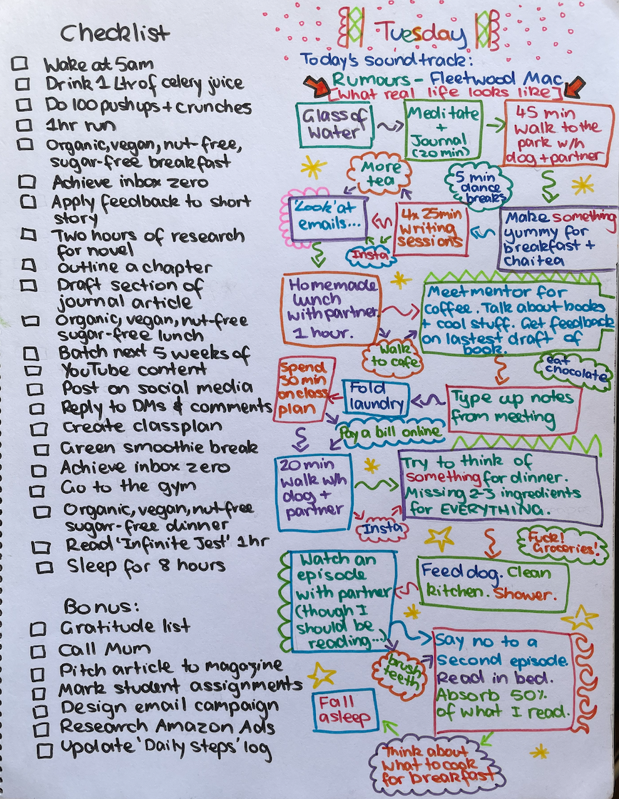 I shared this activity as a way to show other people how ridiculous hustle culture is and how real life is so much more colourful and responsive; instead, it showed me how much damn pressure I put on myself. Maybe you can relate.
